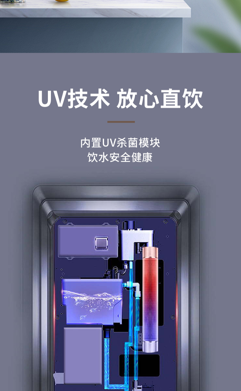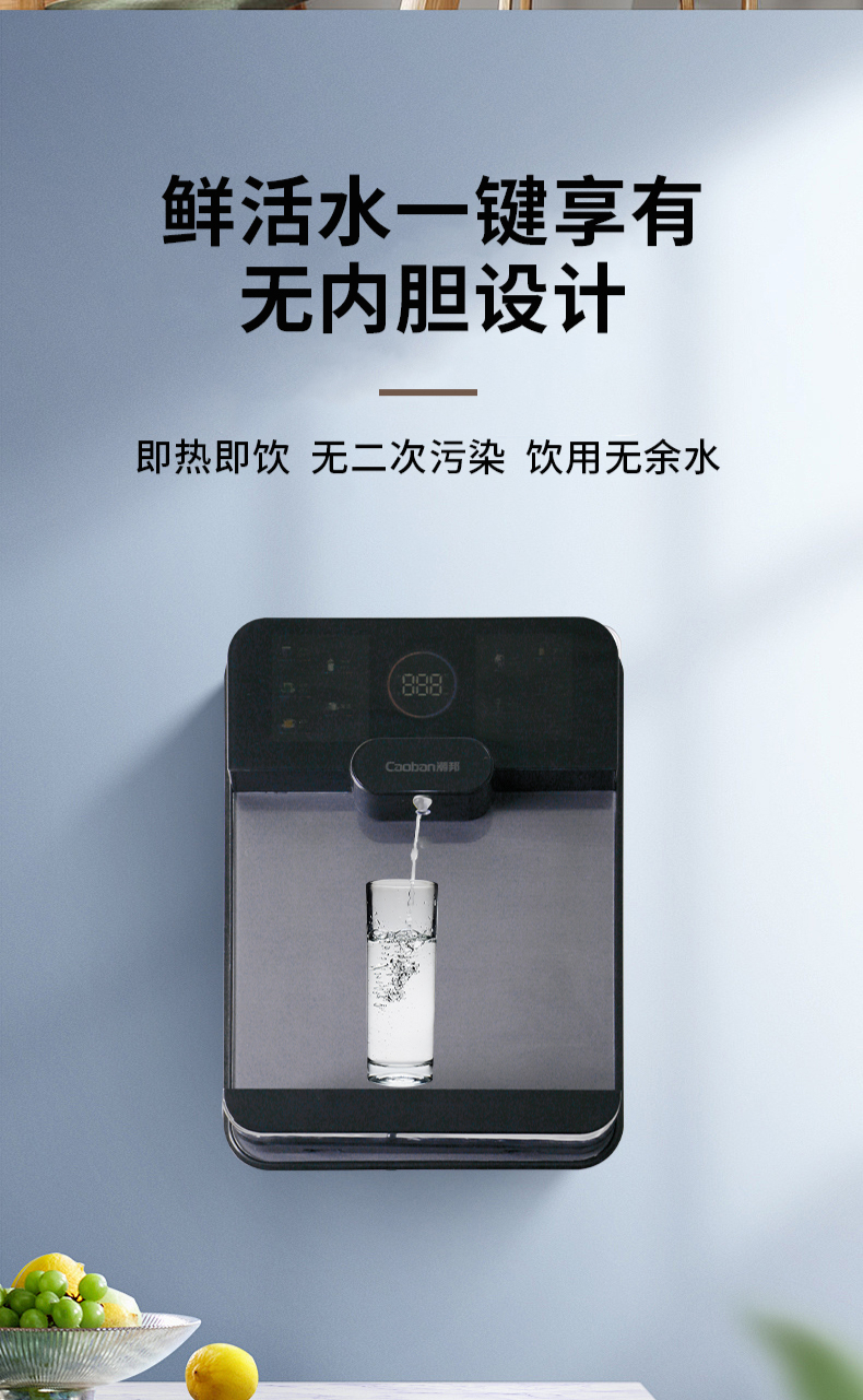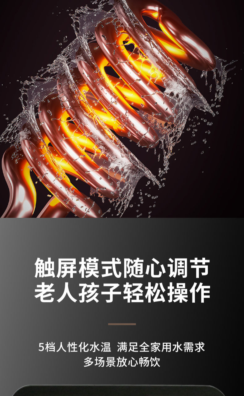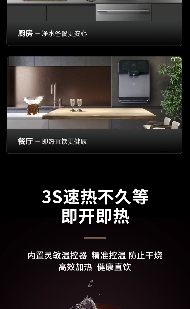 3秒速熱,5檔水溫,4檔水量,水汽分離,UV紫外線抑菌,無(wú)內(nèi)膽即熱即飲,全通量RO凈水器通用,多重安全保護(hù)
