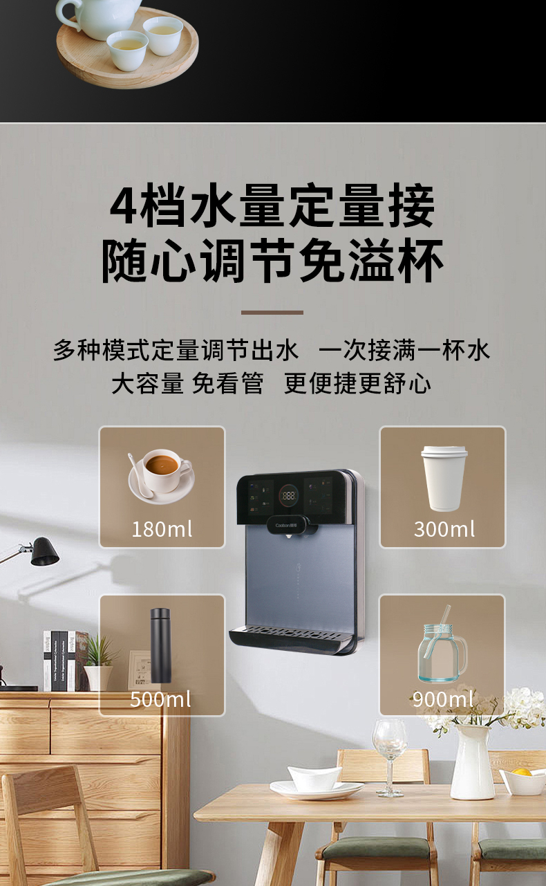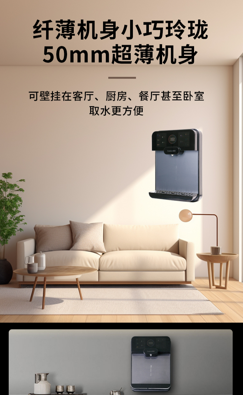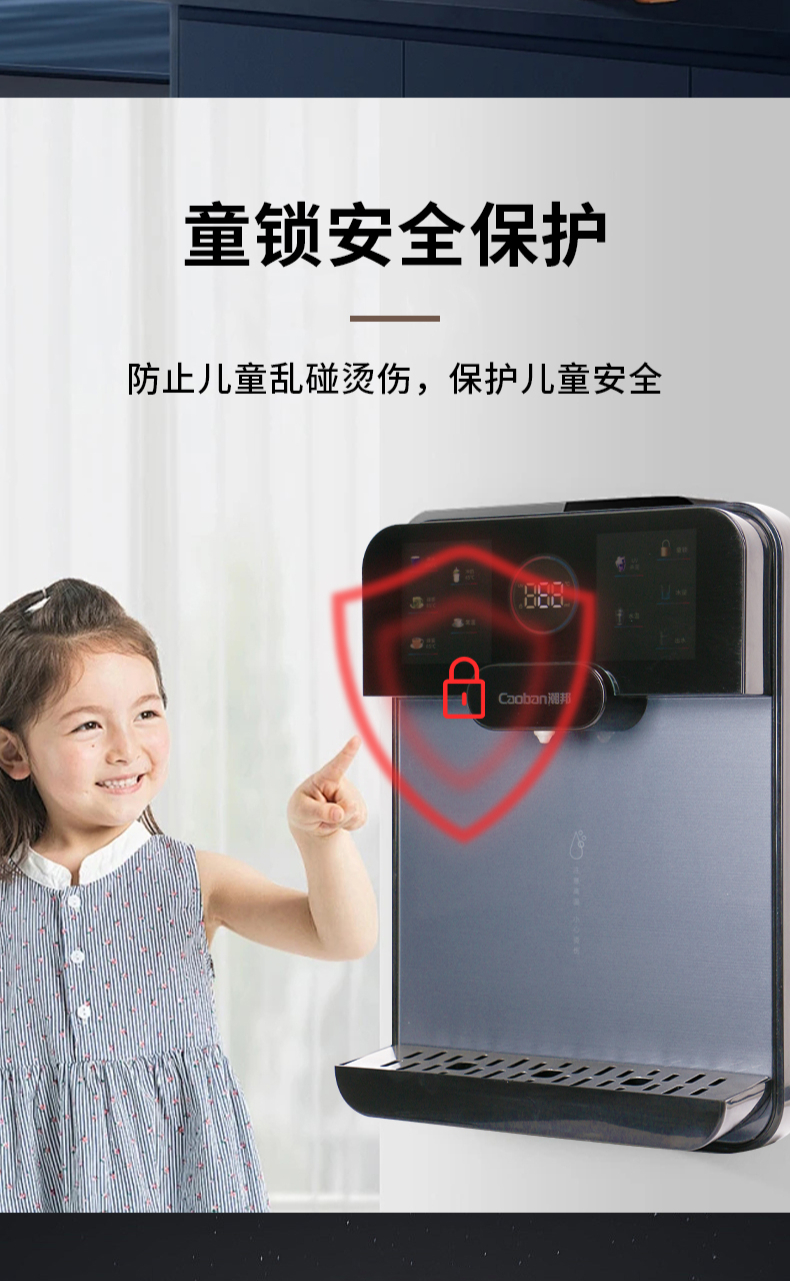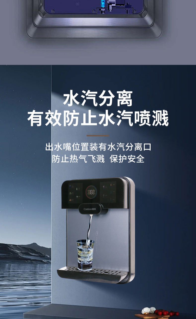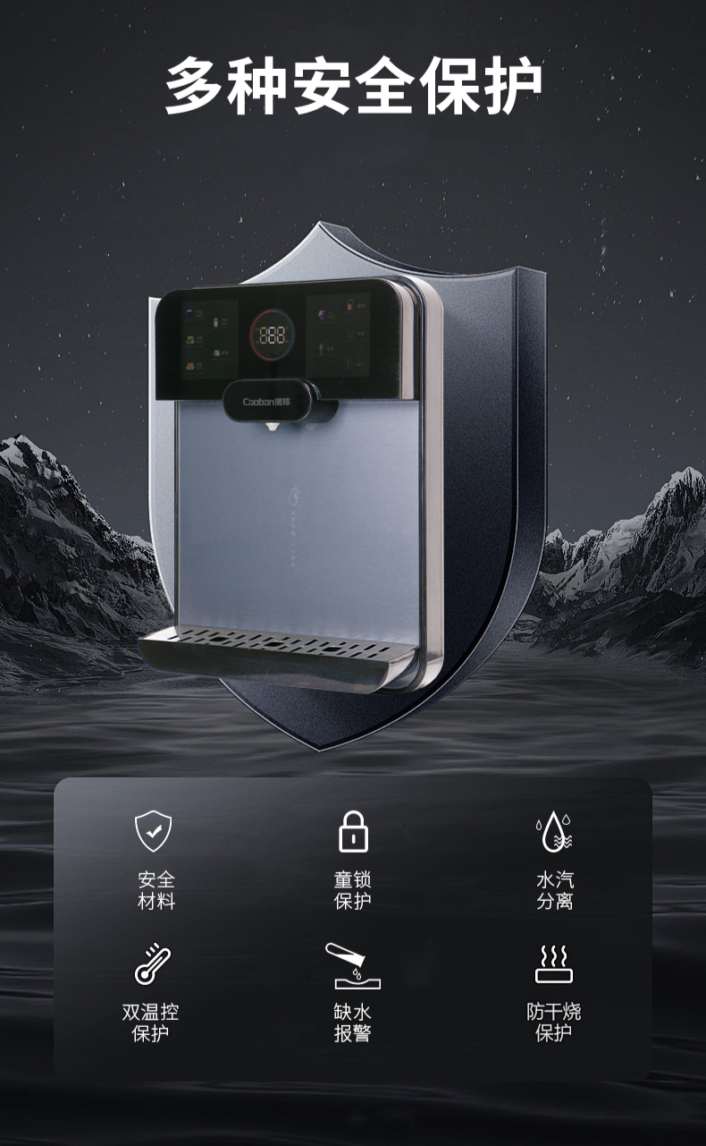3秒速熱,5檔水溫,4檔水量,水汽分離,UV紫外線抑菌,無(wú)內(nèi)膽即熱即飲,全通量RO凈水器通用,多重安全保護(hù)