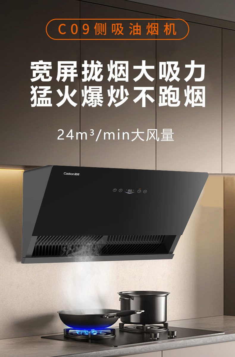寬屏攏煙大吸力 猛火爆炒不跑煙