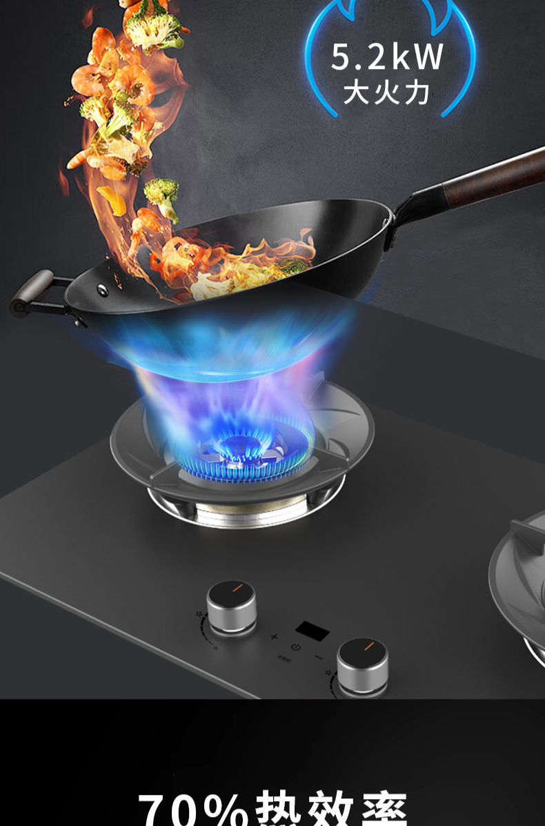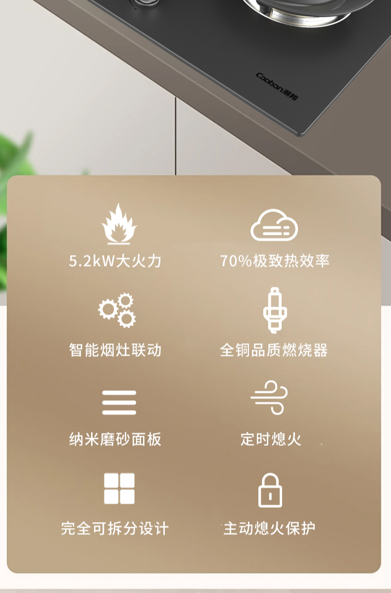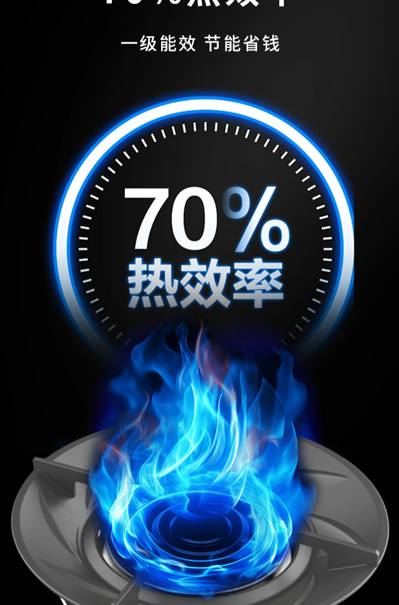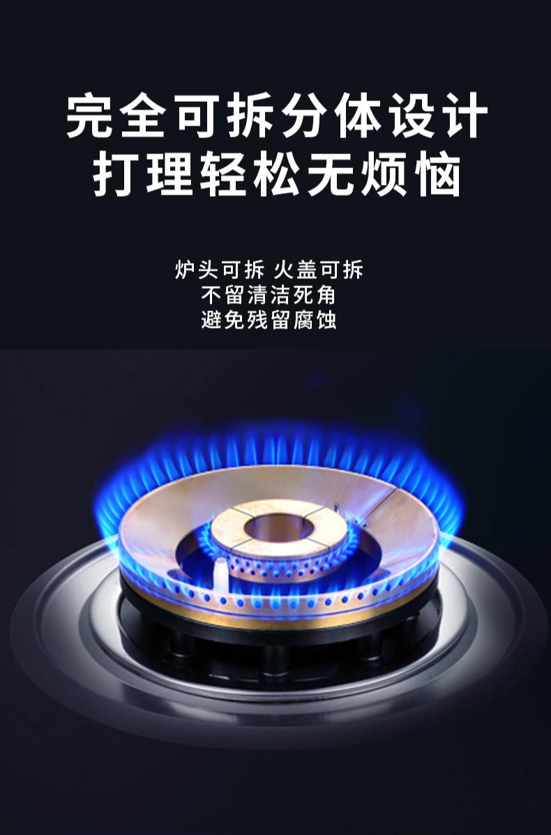 大火力,70%熱效率;智能煙灶聯(lián)動;全銅燃燒器;完全可拆分設(shè)計;主動熄火保護;