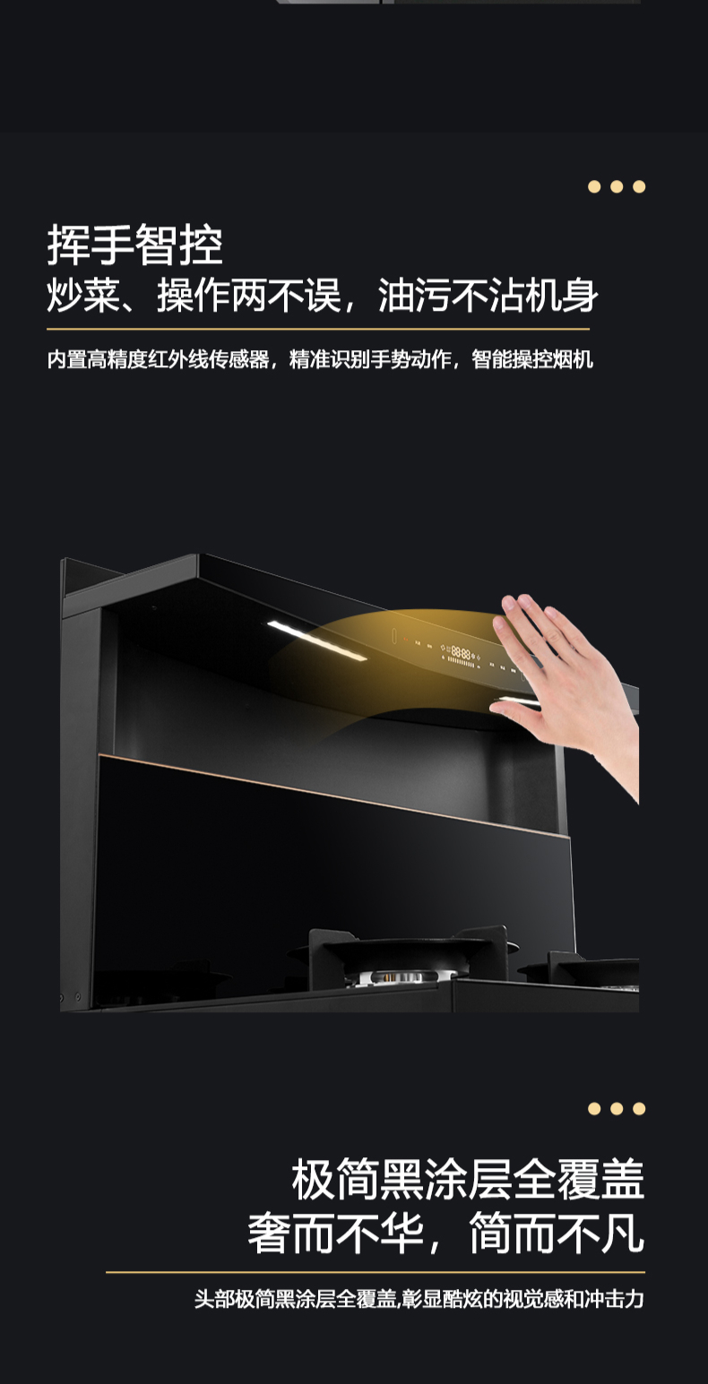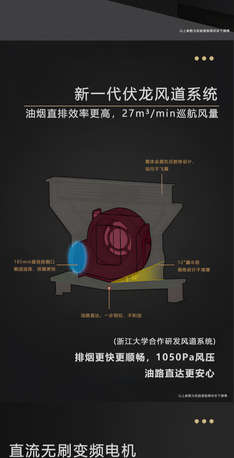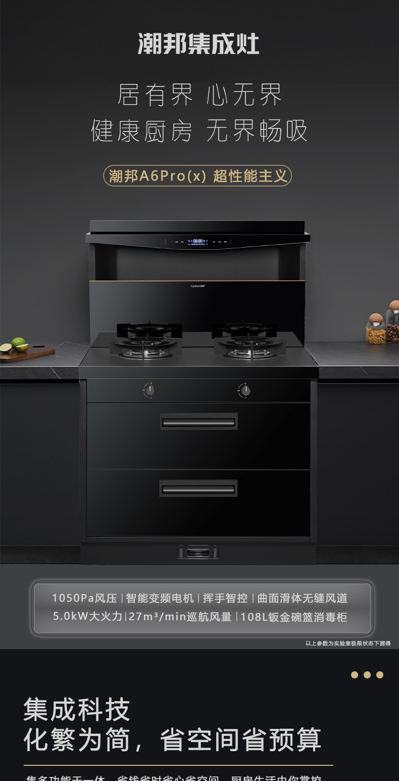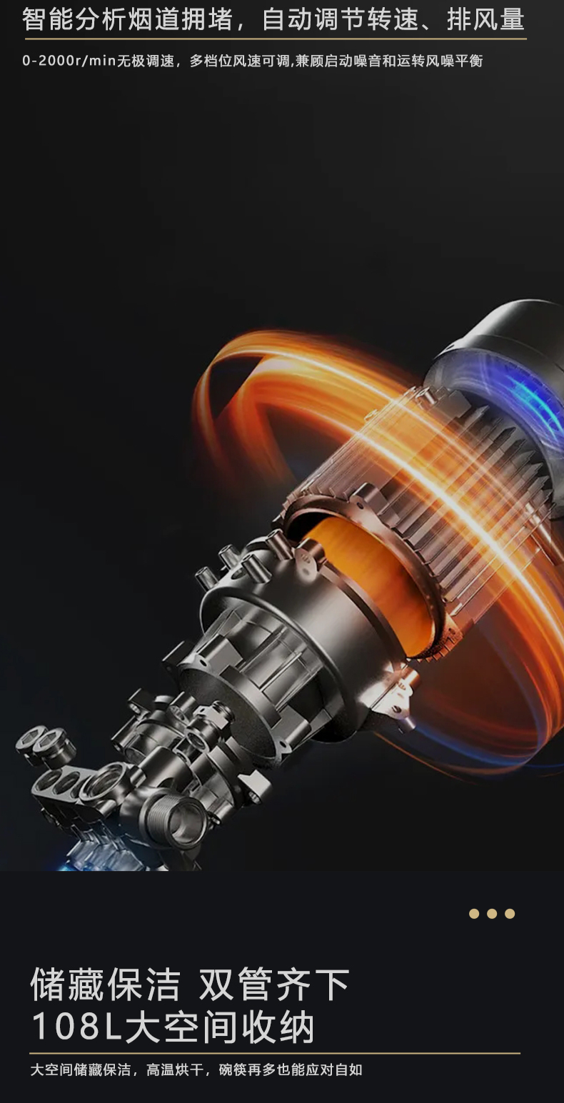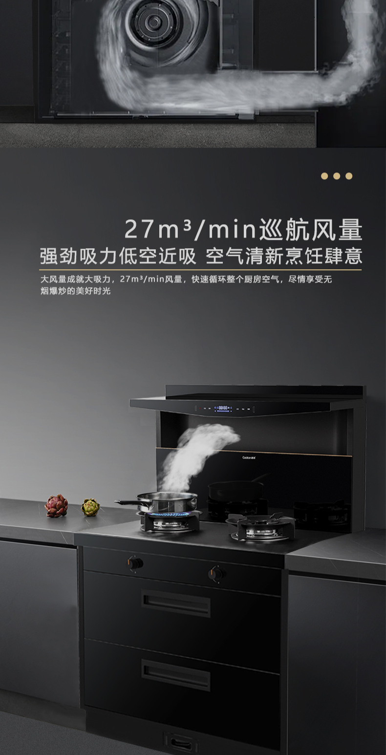 1050Pa風(fēng)壓|智能變頻電機|揮手智控|曲面滑體無縫風(fēng)道 5 0kW大火力|27m3 min巡航風(fēng)量|108L鈑金碗籃消毒柜