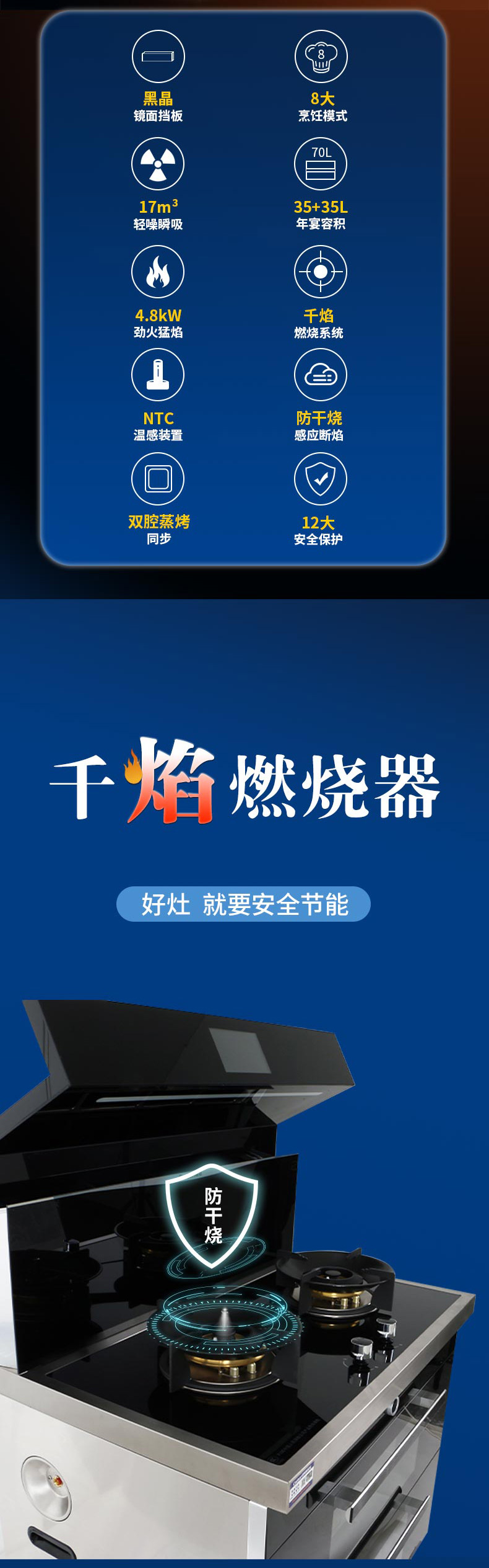 智能防干燒,雙腔蒸烤,4 8kW勁火。